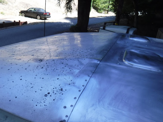 The paint was still drying on the vents and trim rings so your trusty blogger decided to wire wheel the old dried glue off the inside of the roof. Before photo;